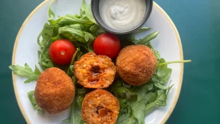 Fresh homemade beef balls , cherry tomato , green chilli , mixed herbs , cooked in a tomato sauce and topped with parmesan cheese and served with two slice of bread .