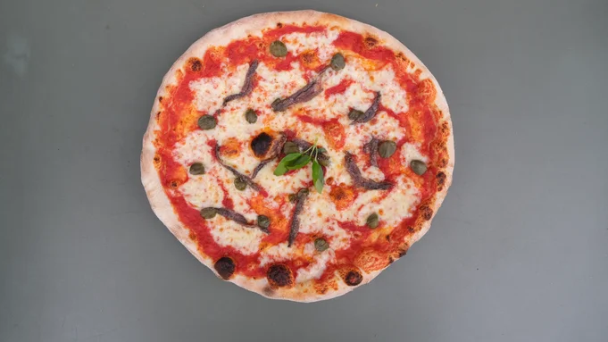 fior di latte mozzarella , Da Vinci Pizza sauce, anchovies, capers and oregano.